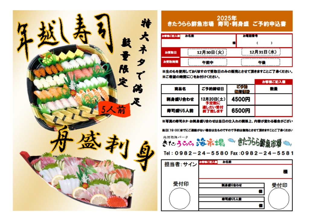 毎年恒例になっております年末の大晦日受取り「寿司盛合わせ・刺身盛合わせ」の予約受付を開始しております。受け取り日は12月30日と12月31日(大晦日)のいずれか選択可能です。スマートフォンでご覧の方は、このページに申込み用紙を添付しておりますので、そちらをご覧ください。多数のご予約をお待ちしております。パソコンにてHPをご覧の方はHP上部にあります「きたうらら海市場」ロゴマークの下部からも申し込み用紙の内容をご覧頂けます。
